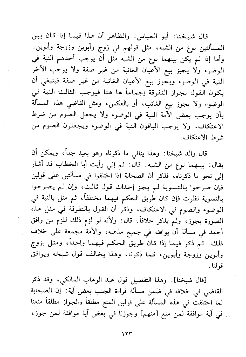 [قال شيخنا] : وهذا التفصيل قول عبد الوهاب المالكي، وقد ذكر القاضي في خلافه في ضمن مسألة قراءة الجنب بعض آية: إن الصحابة لما اختلفت في هذه المسألة على قولين المنع مطلقا والجواز مطلقا منعنا في آية موافقة لمن منع [منهم] وجوزنا في بعض آية موافقة لمن جوز،
