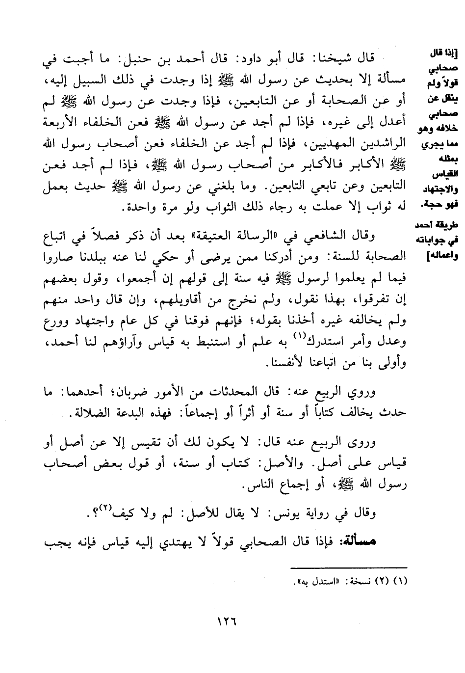 قال شيخنا: قال أبو داود: قال أحمد بن حنبل: ما أجبت في مسألة إلا بحديث عن رسول الله - صلى الله عليه وسلم - إذا وجدت في ذلك السبيل إليه، أو عن الصحابة أو عن التابعين فإذا وجدت عن رسول الله - صلى الله عليه وسلم - لم أعدل إلى غيره، فإذا لم أجد عن رسول الله - صلى الله عليه وسلم - فعن الخلفاء الأربعة الراشدين المهديين فإذا لم أجد عن الخلفاء فعن أصحاب رسول الله - صلى الله عليه وسلم - الأكابر فالأكابر من أصحاب رسول الله - صلى الله عليه وسلم - فإذا لم أجد فعن التابعين وعن تابعي التابعين، وما بلغني عن رسول الله - صلى الله عليه وسلم - حديث يعمل له ثواب إلا عملت به رجاء ذلك الثواب ولو مرة واحدة.