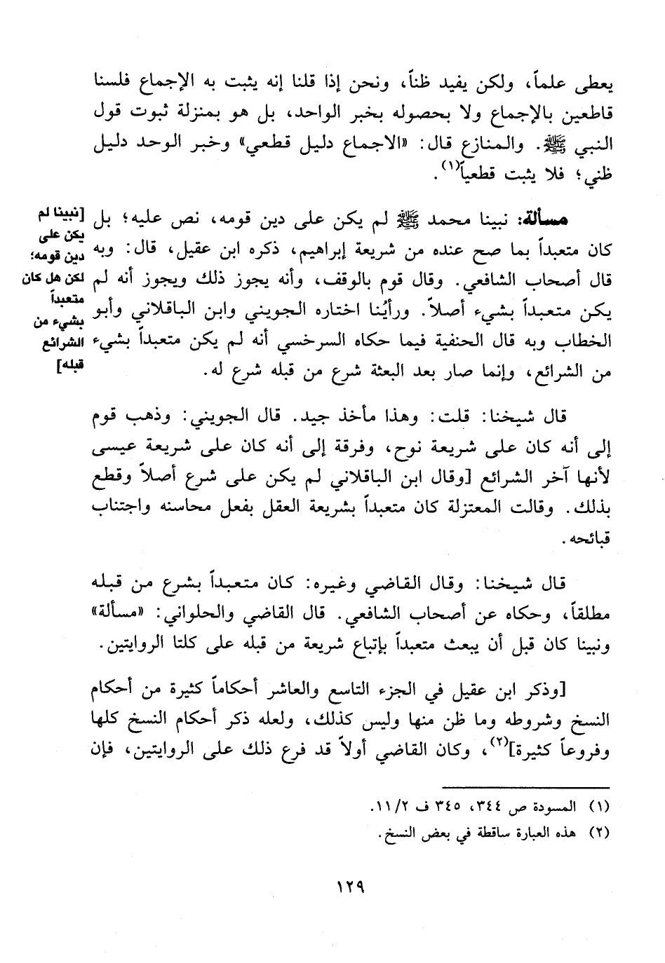 مسألة: نبينا محمد - صلى الله عليه وسلم - لم يكن على دين قومه نص عليه، بل كان متعبدًا بما صح عنده من شريعة إبراهيم ذكره ابن عقيل، قال: وبه قال أصحاب الشافعي. وقال قوم بالوقف، وأنه يجوز ذلك ويجوز أنه لم يكن متعبدا بشيء أصلا. ورأينا اختاره الجويني وابن الباقلاني وأبو الخطاب وبه قال الحنفية فيما حكاه السرخسي أنه لم يكن متعبدا بشيء من الشرائع وإنما صار بعد البعثة شرع من قبله شرع له.