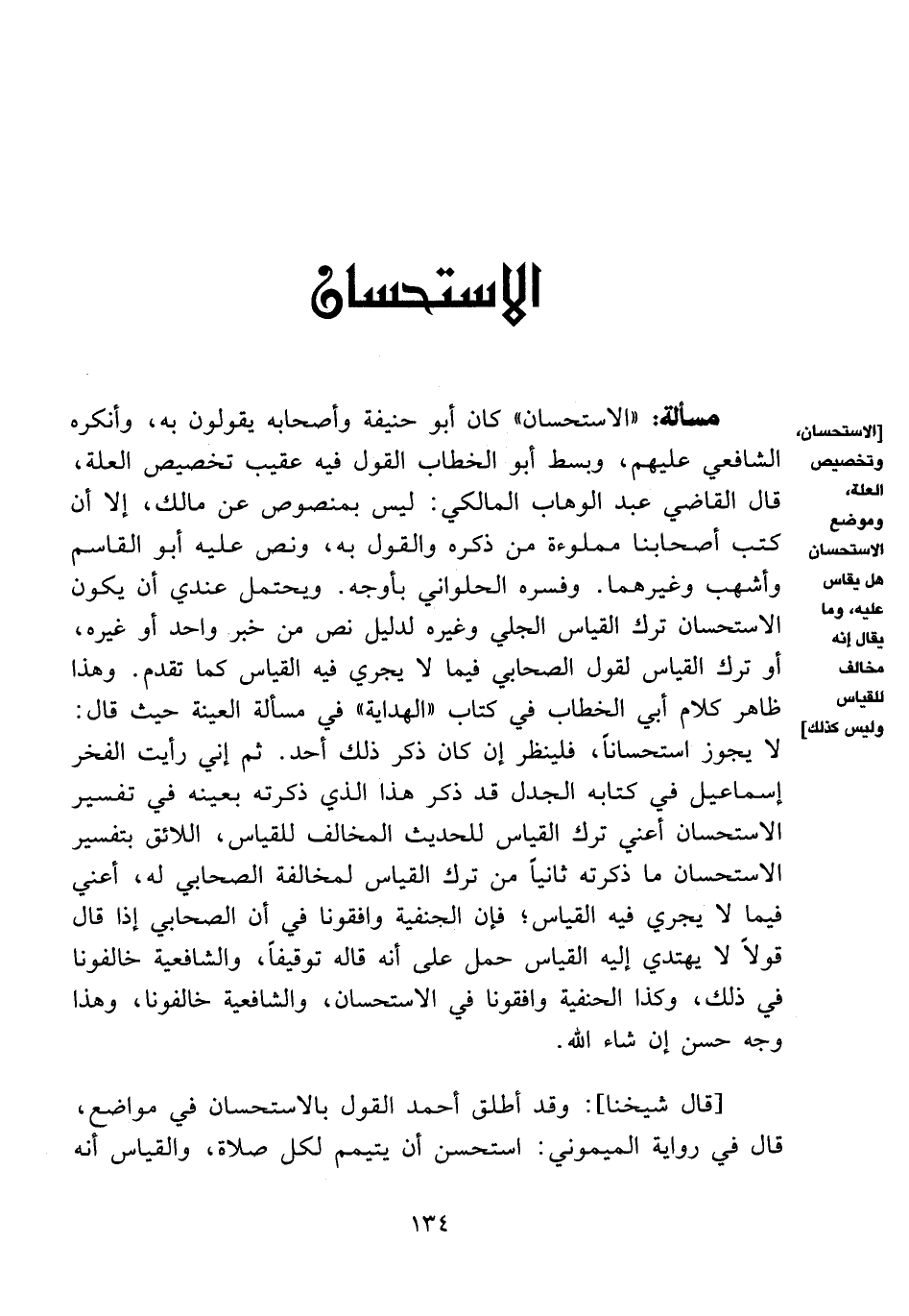 مسألة: «الاستحسان» كان أبو حنيفة وأصحابه يقولون به، وأنكره الشافعي عليهم، وبسط أبو الخطاب القول فيه عقيب تخصيص العلة، قال القاضي عبد الوهاب المالكي: ليس بمنصوص عن مالك، إلا أن كتب أصحابنا مملوءة من ذكره والقول به، ونص عليه أبو القاسم وأشهب وغيرهما، وفسره الحلواني بأوجه. ويحتمل عندي أن يكون الاستحسان ترك القياس الجلي وغيره الدليل نص من خبر واحد أو غيره، أو ترك القياس لقول الصحابي فيما لا يجري فيه القياس كما تقدم. وهذا ظاهر كلام أبي الخطاب في كتاب «الهداية» في مسألة العينة حيث قال: لا يجوز استحسانا فلينظر إن كان ذكر ذلك أحد. ثم إني رأيت الفخر إسماعيل في كتابه «الجدل» قد ذكر هذا الذي ذكرته بعينه في تفسير الاستحسان أعني ترك القياس للحديث المخالف للقياس، اللائق بتفسير الاستحسان ما ذكرته ثانيا من ترك القياس لمخالفة الصحابي له، أعني فيما لا يجري فيه القياس؛ فإن الحنفية وافقونا في أن الصحابي إذا قال قولا لا يهتدي إلى القياس حمل على أنه قاله توقيفا والشافعية خالفونا في ذلك، وكذا الحنفية وافقونا في الاستحسان، والشافعية خالفونا وهذا وجه حسن إن شاء الله.
