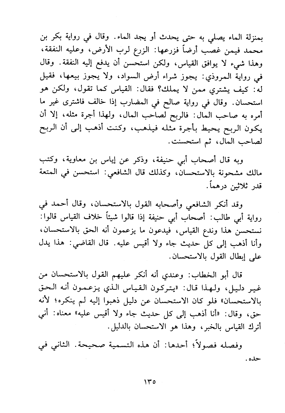 وقد أنكر الشافعي وأصحابه القول بالاستحسان، وقال أحمد في رواية أبي طالب: أصحاب أبي حنيفة إذا قالوا شيئا خلاف القياس قالوا: نستحسن هذا وندع القياس، فيدعون ما يزعمون أنه الحق بالاستحسان، وأنا أذهب إلى كل حديث جاء ولا أقيس عليه. قال القاضي: هذا يدل على إبطال القول بالاستحسان.