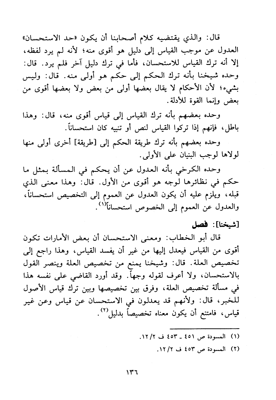 قال: والذي يقتضيه كلام أصحابنا أن يكون «حد الاستحسان» العدول عن موجب القياس إلى دليل هو أقوى منه؛ لأنه لم يرد لفظه إلا أنه ترك القياس للاستحسان، فأما في ترك دليل آخر فلم يرد. قال: وحده شيخنا بأنه ترك الحكم إلى حكم هو أولى منه. قال: وليس بشيء؛ لأن الأحكام لا يقال بعضها أولى من بعض ولا بعضها أقوى من بعض وإنما القوة للأدلة.