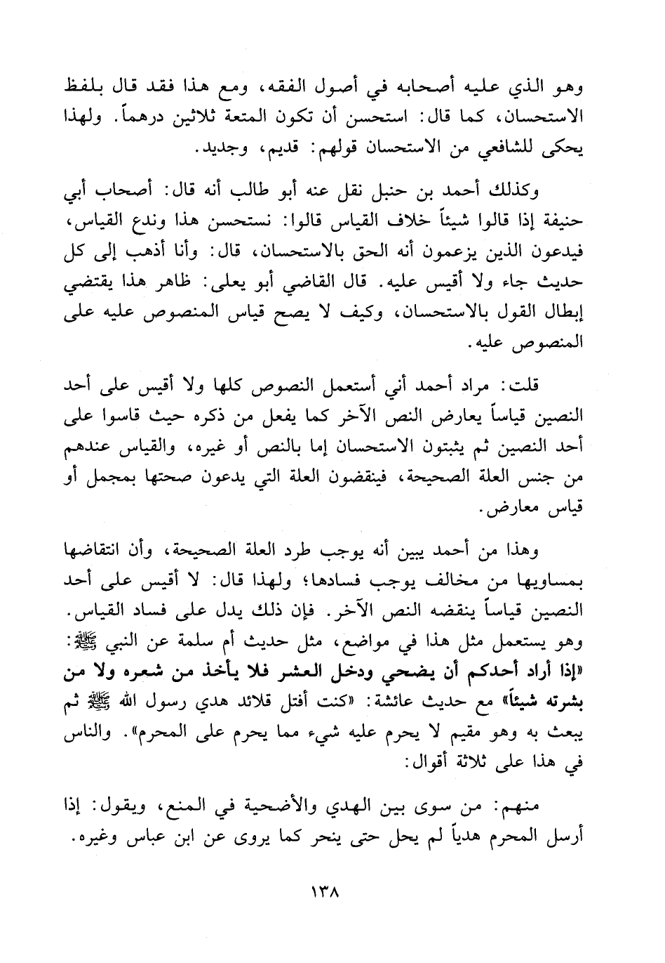 قلت: مراد أحمد أني أستعمل النصوص كلها ولا أقيس على أحد النصين قياسا يعارض النص الآخر كما يفعل من ذكره حيث قاسوا على أحد النصين ثم يثبتون الاستحسان إما بالنص أو غيره، والقياس عندهم من جنس العلة الصحيحة، فينقضون العلة التي يدعون صحتها بمجمل أو قياس معارض.