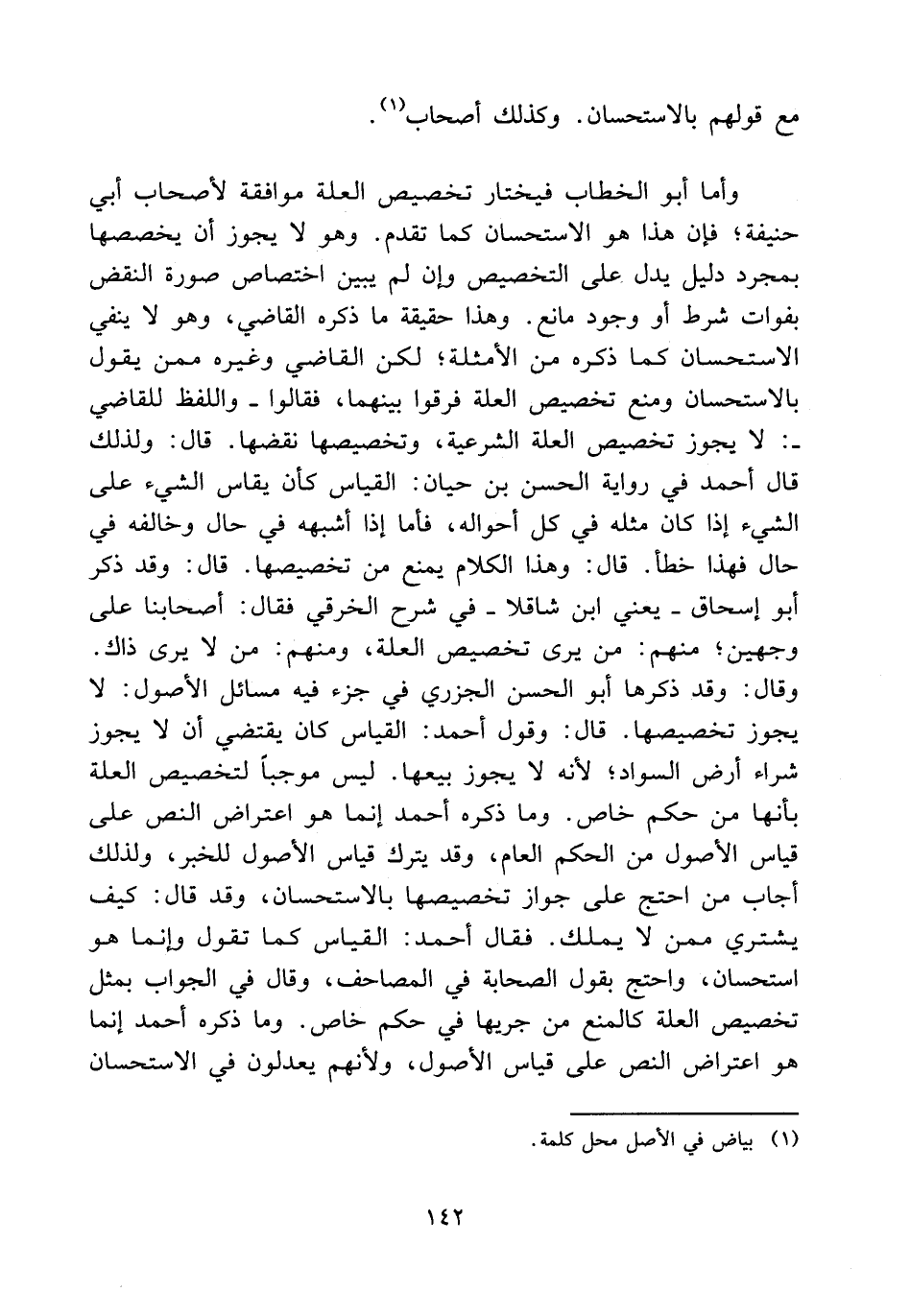 وأما أبو الخطاب فيختار تخصيص العلة موافقة لأصحاب أبي حنيفة؛ فإن هذا هو الاستحسان كما تقدم. وهو لا يجوز أن يخصصها بمجرد دليل يدل على التخصيص وإن لم يبين اختصاص صورة النقض بفوات شرط أو وجود مانع. وهذا حقيقة ما ذكره القاضي، وهو لا ينفي الاستحسان كما ذكره من الأمثلة؛ لكن القاضي وغيره ممن يقول بالاستحسان ومنع تخصيص العلة فرقوا بينهما فقالوا: واللفظ للقاضي لا يجوز تخصيص العلة الشرعية، وتخصيصها نقضها. قال: ولذلك قال أحمد في رواية الحسن بن حيان: القياس كأن يقاس الشيء على الشيء إذا كان مثله في كل أحواله، فأما إذا أشبهه في حال وخالفه في حال فهذا خطأ. قال: وهذا الكلام يمنع من تخصيصها قال: وقد ذكر أبو إسحاق -يعني ابن شاقلا- في شرح الخرقي فقال: أصحابنا على وجهين؛ منهم: من يرى تخصيص العلة، ومنهم من لا يرى ذاك. وقال: وقد ذكرها أبو الحسن الجزري في جزء فيه مسائل الأصول: لا يجوز تخصيصها. قال: وقول أحمد: القياس كان يقتضي ألا يجوز شراء أرض السواد؛ لأنه لا يجوز بيعها. ليس موجبا لتخصيص العلة بأنها من حكم خاص. وما ذكره أحمد إنما هو اعتراض النص على قياس الأصول من الحكم العام. وقد يترك قياس الأصول للخبر، ولذلك أجاب من احتج على جواز تخصيصها بالاستحسان، وقد قال: كيف يشتري ممن لا يملك؟ فقال أحمد: القياس كما تقول وإنما هو استحسان، واحتج بقول الصحابة في المصاحف وقال في الجواب بمثل تخصيص العلة كالمنع من جريها في حكم خاص. وما ذكره أحمد إنما هو اعتراض النص على قياس الأصول، ولأنهم يعدلون في الاستحسان