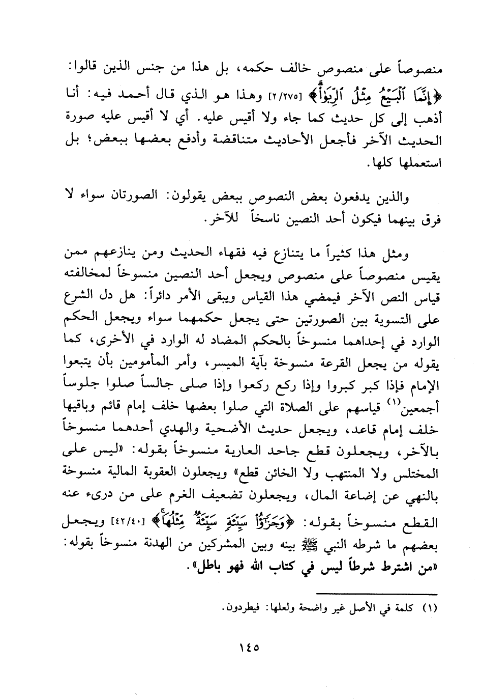 منصوصًا على منصوص خالف حكمه، بل هذا من جنس الذين قالوا: {إِنَّمَا الْبَيْعُ مِثْلُ الرِّبَا} [275/2] وهذا هو الذي قال أحمد فيه: أنا أذهب إلى كل حديث كما جاء ولا أقيس عليه. أي لا أقيس عليه صورة الحديث الآخر فأجعل الأحاديث متناقضة وأدفع بعضها ببعض بل أستعملها كلها.