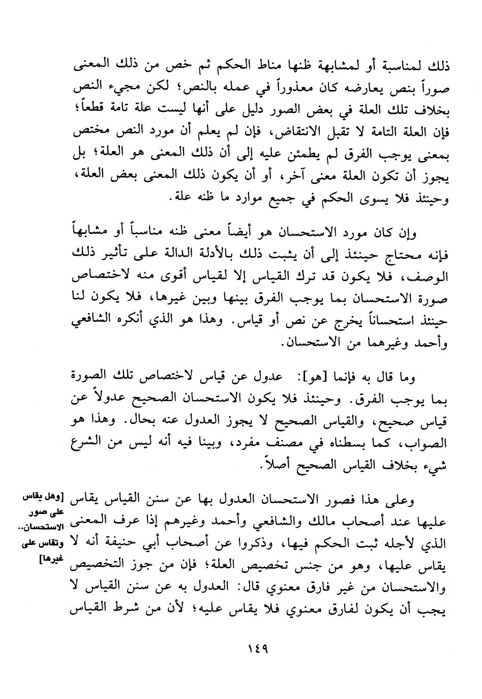 وعلى هذا فصور الاستحسان العدول بها عن سنن القياس يقاس عليها عند أصحاب مالك والشافعي وأحمد وغيرهم إذا عرف المعنى الذي لأجله ثبت الحكم فيها، وذكروا عن أصحاب أبي حنيفة أنه لا يقاس عليها، وهو من جنس تخصيص العلة؛ فإن من جوز التخصيص والاستحسان من غير فارق معنوي قال: العدول به عن سنن القياس لا يجب أن يكون لفارق معنوي فلا يقاس عليه؛ لأن من شرط القياس