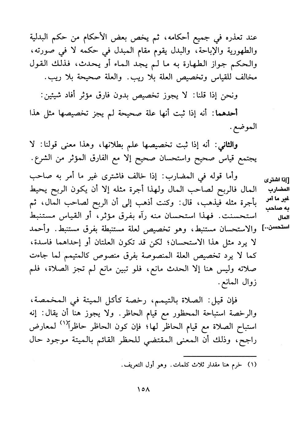 وأما قوله في المضارب: إذا خالف فاشترى غير ما أمر به صاحب المال فالربح لصاحب المال ولهذا أجرة مثله إلا أن يكون الربح يحيط بأجرة مثله فيذهب، قال: وكنت أذهب إلى أن الربح لصاحب المال، ثم استحسنت. فهذا استحسان منه رآه بفرق مؤثر، أو القياس مستنبط والاستحسان مستنبط، وهو تخصيص لعلة مستنبطة بفرق مستنبط. وأحمد لا يرد مثل هذا الاستحسان؛ لكن قد تكون العلتان أو إحداهما فاسدة، كما لا يرد تخصيص العلة المنصوصة بفرق منصوص كالمتيمم لما جاءت صلاته وليس هنا إلا الحدث مانعًا، فلو تبين مانع لم تجز الصلاة، فلم زوال المانع؟
