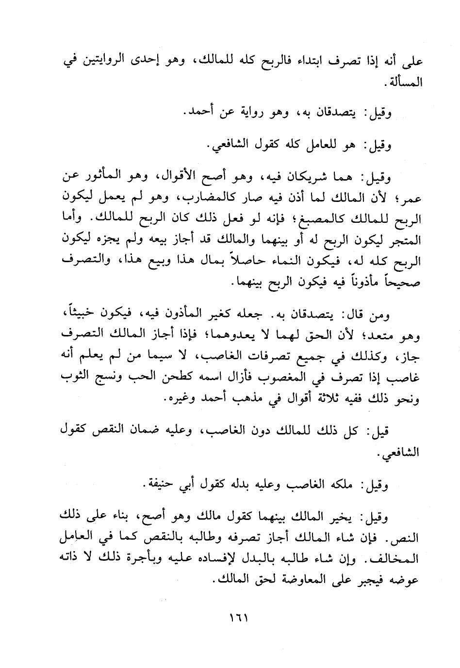 وقيل: هما شريكان فيه، وهو أصح الأقوال، وهو المأثور عن عمر؛ لأن المالك لما أذن فيه صار كالمضارب، وهو لم يعمل ليكون الربح للمالك كالمصبغ؛ فإنه لو فعل ذلك كان الربح للمالك. وأما المتجر ليكون الربح له أو بينهما والمالك قد أجاز بيعه ولم يجزه ليكون الربح كله له، فيكون النماء حاصلا بمال هذا وبيع هذا، والتصرف صحيحا مأذونا فيه فيكون الربح بينهما.