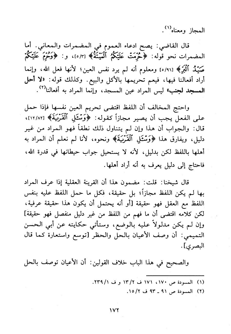 واحتج المخالف أن اللفظ اقتضى تحريم العين نفسها فإذا حمل على الفعل يجب أن يصير مجازا كقوله: {وَاسْأَلِ الْقَرْيَةَ} [82/12] قال: والجواب أن هذا وإن لم يتناول ذلك نطقا فهو المراد من غير دليل ويفارق هذا {وَاسْأَلِ الْقَرْيَةَ} نحوه، لأنا لم نعلم أن المراد به أهلها باللفظ لكن بدليل لأنه لا يستحيل جواب حيطانها في قدرة الله، فاحتاج إلى دليل يعرف به أنه أراد أهلها.
