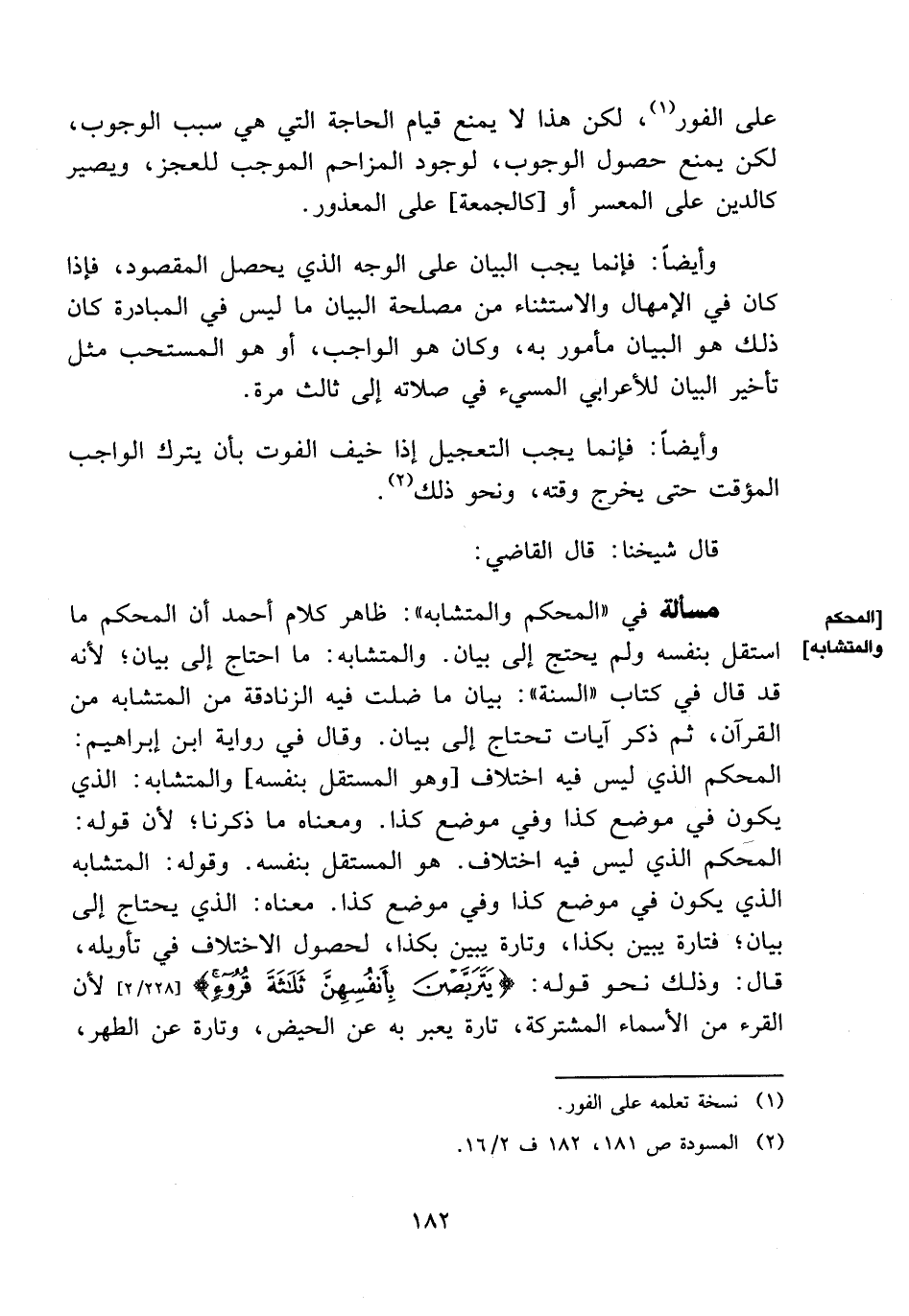 مسألة: في «المحكم والمتشابه» : ظاهر كلام أحمد أن المحكم ما استقل بنفسه ولم يحتج إلى بيان. والمتشابه: ما احتاج إلى بيان؛ لأنه قد قال في كتاب «السنة» : بيان ما ضلت فيه الزنادقة من المتشابه من القرآن، ثم ذكر آيات تحتاج إلى بيان. وقال في رواية ابن إبراهيم: المحكم الذي ليس فيه اختلاف [وهو المستقل بنفسه] والمتشابه: الذي يكون في موضع كذا وفي موضع كذا. ومعناه ما ذكرنا؛ لأن قوله: المحكم الذي ليس فيه اختلاف. هو المستقل بنفسه. وقوله: المتشابه الذي يكون في موضع كذا وفي موضع كذا. معناه: الذي يحتاج إلى بيان؛ فتارة يبين بكذا، وتارة يبين بكذا، لحصول الاختلاف في تأويله، قال: وذلك نحو قوله: {يَتَرَبَّصْنَ بِأَنْفُسِهِنَّ ثَلَاثَةَ قُرُوءٍ} [228/2] لأن القرء من الأسماء المشتركة، تارة يعبر به عن الحيض، وتارة عن الطهر،