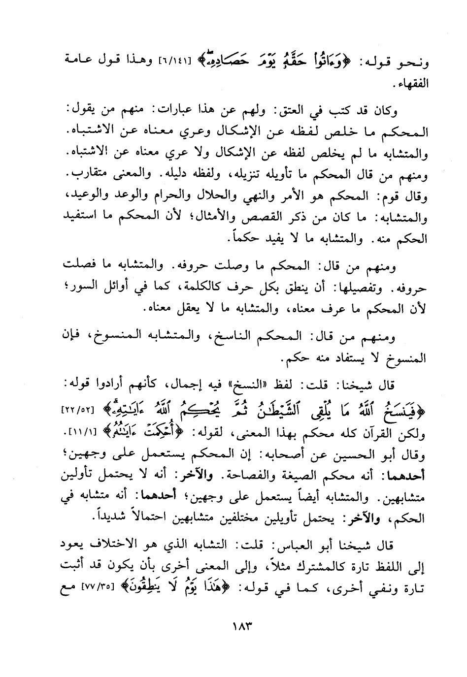 قال شيخنا: قلت: لفظ «النسخ» فيه إجمال، كأنهم أرادوا قوله: {فَيَنْسَخُ اللَّهُ مَا يُلْقِي الشَّيْطَانُ ثُمَّ يُحْكِمُ اللَّهُ آَيَاتِهِ} [52/22] ولكن القرآن كله محكم بهذا المعنى، لقوله: {أُحْكِمَتْ آَيَاتُهُ} [1/11] . وقال أبو الحسين عن أصحابه: إن المحكم يستعمل على وجهين؛ أحدهما: أنه محكم الصيغة والفصاحة. والآخر: أنه لا يحتمل تأويلين متشابهين. والمتشابه أيضا يستعمل على وجهين؛ أحدهما: أنه متشابه في الحكم، والآخر: يحتمل تأويلين مختلفين متشابهين احتمالا شديدا.