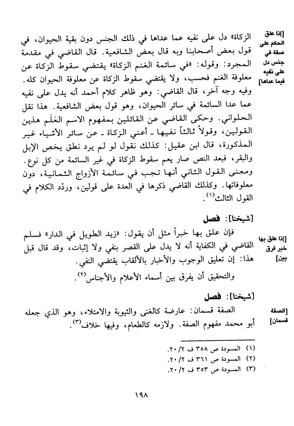 الزكاة» دل على نفيه عما عداها في ذلك الجنس دون بقية الحيوان، في قول بعض أصحابنا وبه قال بعض الشافعية. قال القاضي في مقدمة المجرد: وقوله: «في سائمة الغنم الزكاة» يقتضي سقوط الزكاة عن معلوفة الغنم فحسب ولا يقتضي سقوط الزكاة عن معلوفة الحيوان كله. وفيه وجه آخر، قال القاضي: وهو ظاهر كلام أحمد أنه يدل على نفيه عما عدا السائمة في سائر الحيوان، وهو قول بعض الشافعية. هذا نقل الحلواني وحكى القاضي عن القائلين بمفهوم الاسم العلم هذين القولين، وقولا ثالثا نفيها -أعني الزكاة- عن سائر الأشياء غير المذكورة قال ابن عقيل: كذلك نقول: لو لم يرد نطق يخص الإبل والبقر، فبعد النص صار يعم سقوط الزكاة في غير السائمة من كل نوع. ومعنى القول الثاني أنها تجب في سائمة الأزواج الثمانية، دون معلوفاتها. وكذلك القاضي ذكرها في العدة على قولين، وردد الكلام في القول الثالث (1) .