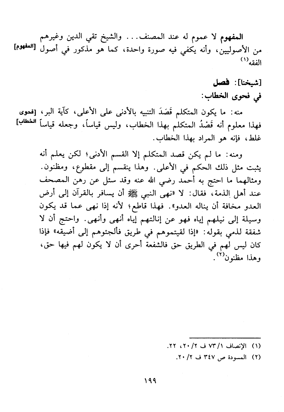 ومنه: ما لم يكن قصد المتكلم إلا القسم الأدنى؛ لكن يعلم أنه يثبت مثل ذلك الحكم في الأعلى. وهذا ينقسم إلى مقطوع، ومظنون. ومثالهما ما احتج به أحمد رضي الله عنه وقد سئل عن رهن المصحف عند أهل الذمة، فقال: لا «نهى النبي - صلى الله عليه وسلم - أن يسافر بالقرآن إلى أرض العدو مخافة أن يناله العدو» . فهذا قاطع؛ لأنه إذا نهى عما قد يكون وسيلة إلى نيلهم إياه فهو عن إنالتهم إياه أنهى وأنهى. واحتج أن لا شفقة لذمي بقوله: «إذا لقيتموهم في طريق فألجئوهم إلى أضيقه» فإذا كان ليس لهم في الطريق حق فالشفعة أحرى ألا يكون لهم فيها حق، وهذا مظنون (2) .