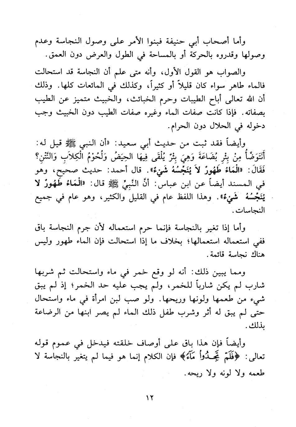 وأيضا فقد ثبت من حديث أبي سعيد: أن النبي - صلى الله عليه وسلم - قيل له: أنتوضأ من بئر بضاعة وهي بئر يلقى فيها الحيض ولحوم الكلاب والنتن؟ فقال: «الماء طهور لا ينجسه شيء» . قال أحمد: حديث صحيح، وهو في المسند أيضا عن ابن عباس: أن النبي - صلى الله عليه وسلم - قال: «الماء طهور لا ينجسه شيء» وهذا اللفظ عام في القليل والكثير، وهو عام في جميع النجاسات.