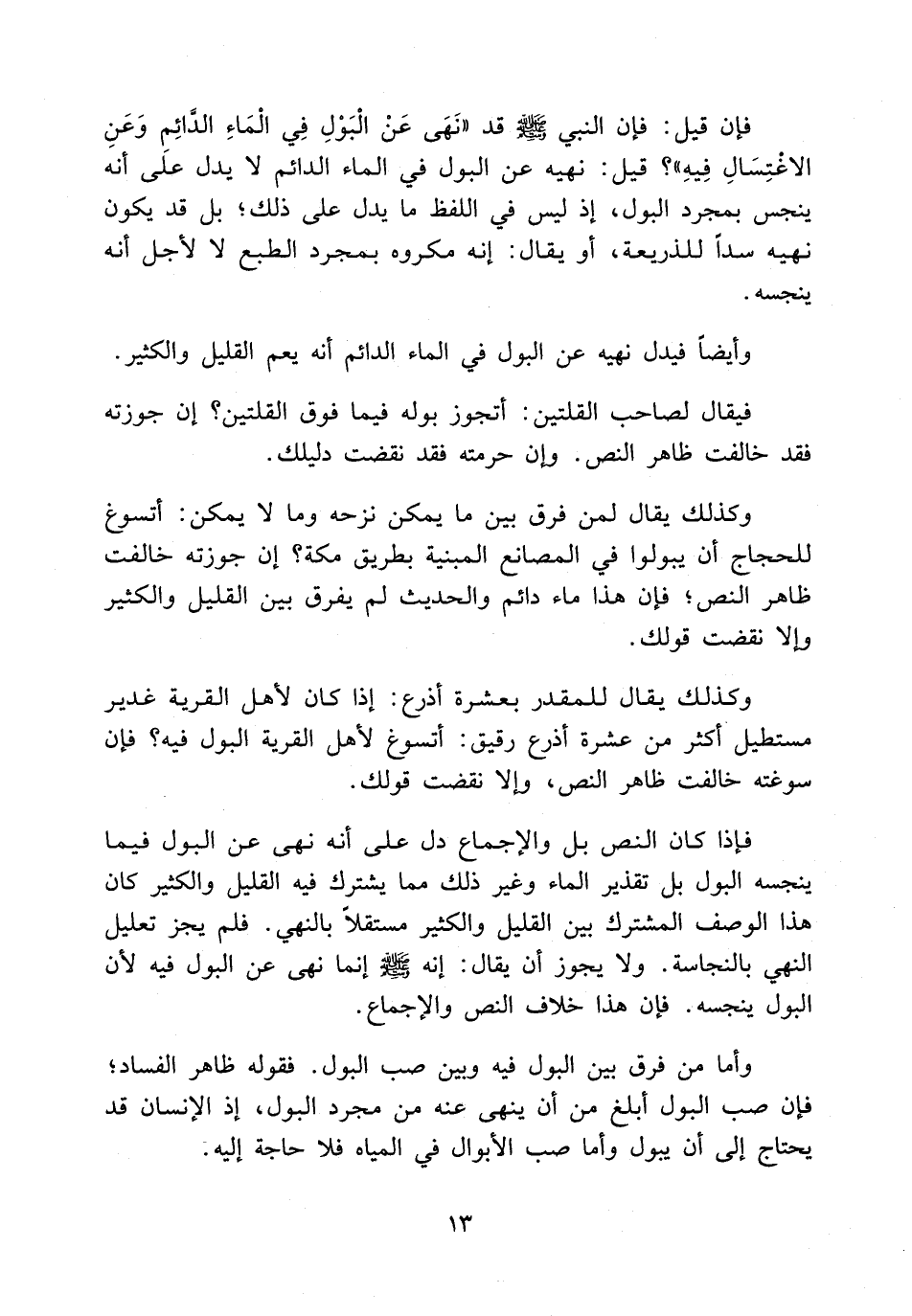 وكذلك يقال لمن فرق بين ما يمكن نزحه وما لا يمكن: أتسوغ للحجاج أن يبولوا في المصانع المبنية بطريق مكة؟ إن جوزته خالفت ظاهر النص؛ فإن هذا ماء دائم والحديث لم يفرق بين القليل والكثير إلا نقضت قولك.
