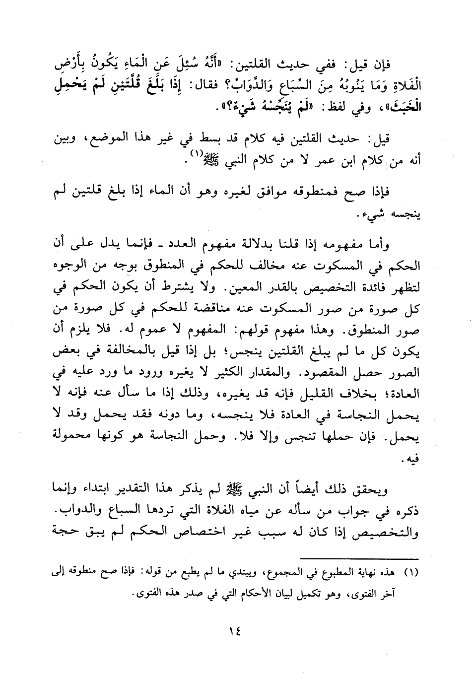 قيل: حديث القلتين فيه كلام قد بسط في غير هذا الموضع، وبين أنه من كلام ابن عمر لا من كلام النبي - صلى الله عليه وسلم - (1) .
