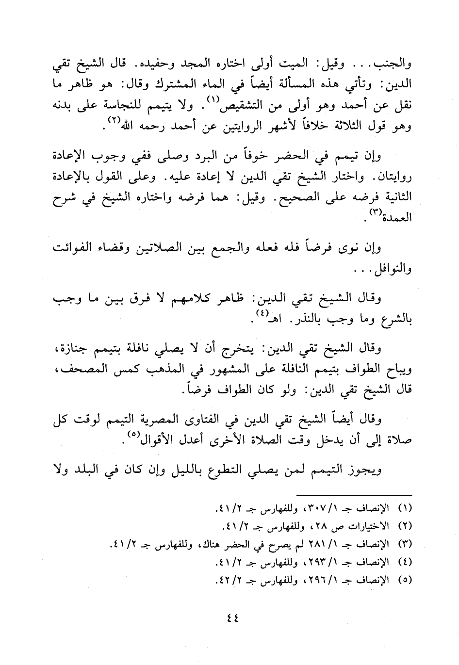 والجنب ... وقيل: الميت أولى اختاره المجد وحفيده، قال الشيخ تقي الدين: وتأتي هذه المسألة أيضا في الماء المشترك وقال: هو ظاهر ما نقل عن أحمد وهو أولى من التشقيص (1) ولا يتيمم للنجاسة على بدنه وهو قول الثلاثة خلافا لأشهر الروايتين عن أحمد رحمه الله (2) .