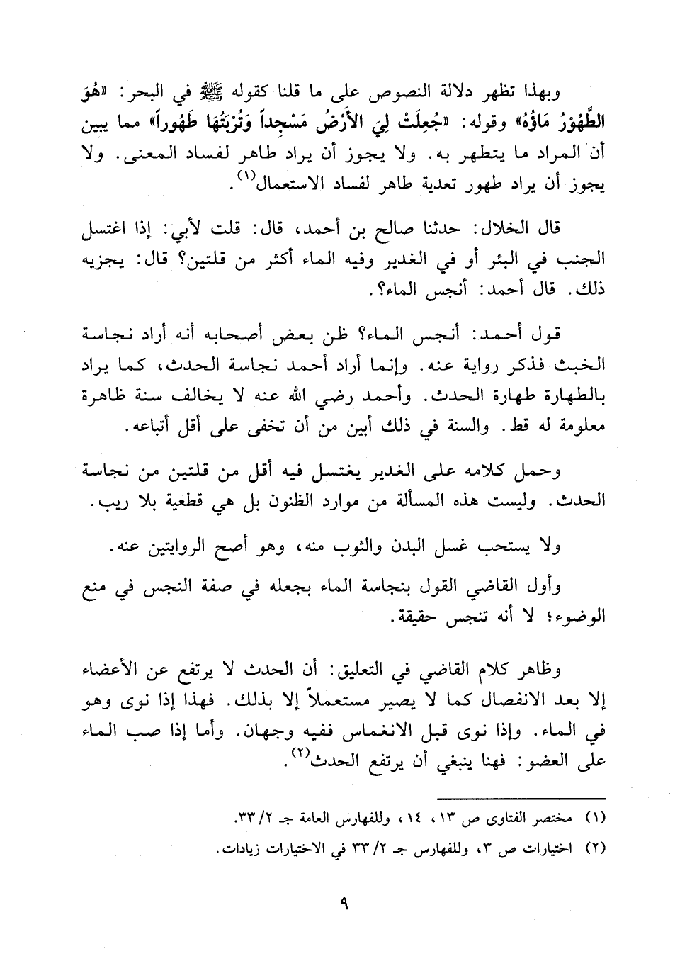 قول أحمد: أنجس الماء؟ ظن بعض أصحابه أنه أراد نجاسة الخبث فذكر رواية عنه: وإنما أراد أحمد نجاسة الحدث، كما يراد بالطهارة طهارة الحدث، وأحمد رضي الله عنه لا يخالف سنة ظاهرة معلومة له قط، والسنة في ذلك أبين من أن تخفى على أقل أتباعه.