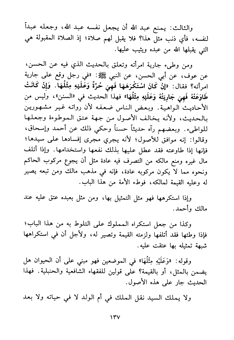 ومن وطئ جارية امرأته وتعلق بالحديث الذي فيه عن الحسن، عن عوف، عن أبي الحسن، عن النبي - صلى الله عليه وسلم -: في رجل وقع على جارية امرأته؟ فقال: «إن كان استكرهها فهي حرة وعليه مثلها، وإن كانت طاوعته فهي جاريته وعليه مثلها» فهذا الحديث في «السنن» ، وليس من الأحاديث الواهية. وبعض الناس ضعفه لأن رواته غير مشهورين بالحديث، ولأنه يخالف الأصول من جهة عتق الموطوءة وجعلها للواطئ. وبعضهم رآه حديثًا حسنًا وحكي ذلك عن أحمد وإسحاق، وقالوا: إنه موافق للأصول؛ لأنه يجري مجرى إفسادها على سيدها؛ فإنها إذا طاوعته فقد عطل عليها بذلك نفعها واستخدامها، وإذا أتلف مال غيره ومنع مالكه من التصرف فيه عادة مثل أن يجوع مركوب الحاكم ونحوه مما لا يكون مركوبه عادة، فإنه في مذهب مالك ومن تبعه يصير له وعليه القيمة لمالكه، فوطء الأمة من هذا الباب.