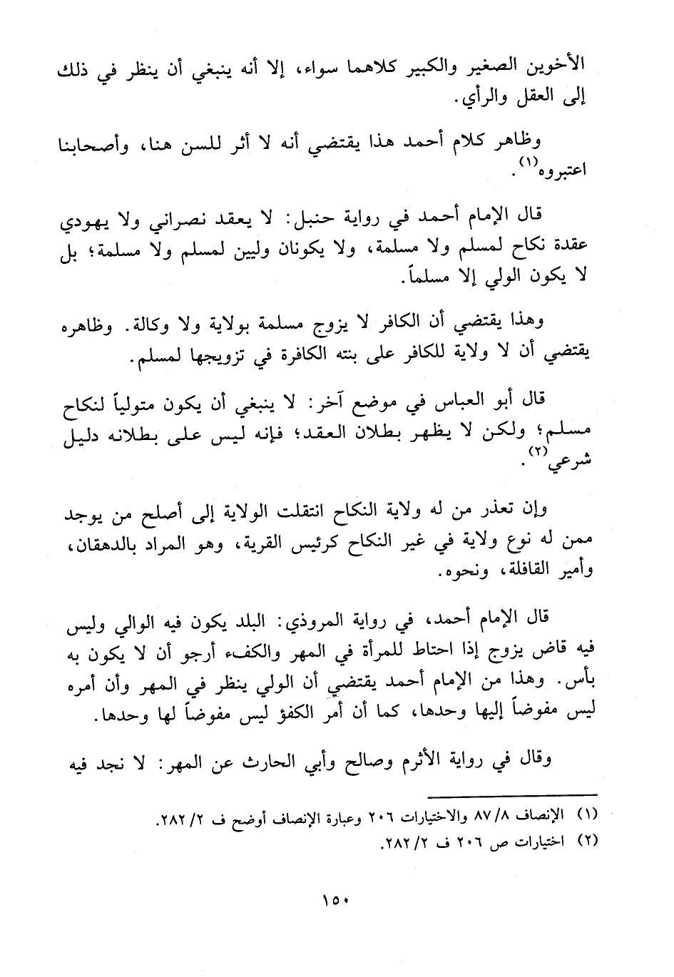 قال الإمام أحمد في رواية حنبل: لا يعقد نصراني ولا يهودي عقدة نكاح لمسلم ولا مسلمة، ولا يكونان وليين لمسلم ولا مسلمة؛ بل لا يكون الولي إلا مسلمًا.
