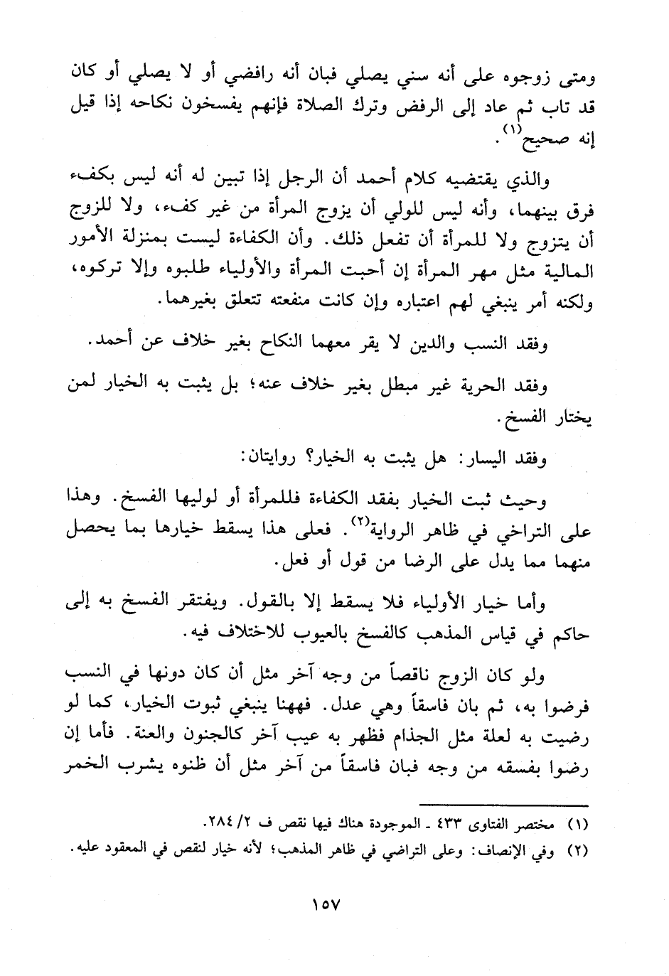 والذي يقتضيه كلام أحمد أن الرجل إذا تبين له أنه ليس بكفء فرق بينهما، وأنه ليس للولي أن يزوج المرأة من غير كفء، ولا للزوج أن يتزوج ولا للمرأة أن تفعل ذلك. وأن الكفاءة ليست بمنزلة الأمور المالية مثل مهر المرأة إن أحبت المرأة والأولياء طلبوه وإلا تركوه، ولكنه أمر ينبغي لهم اعتباره وإن كانت منفعته تتعلق بغيرهما.