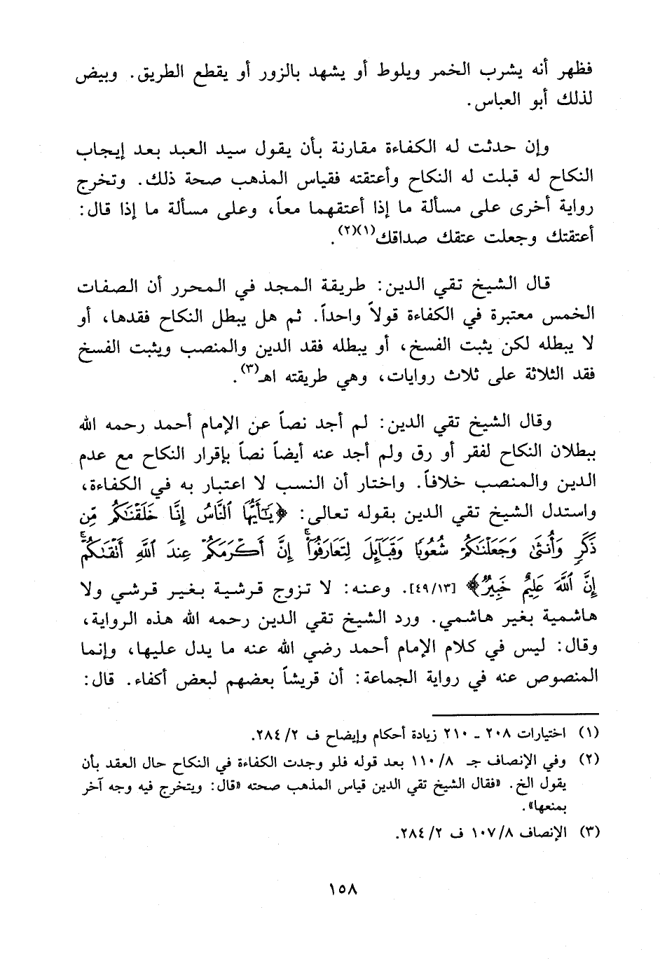 وقال الشيخ تقي الدين: لم أجد نصًا عن الإمام أحمد رحمه الله ببطلان النكاح لفقر أو رق ولم أجد عنه أيضًا نصًا بإقرار النكاح مع عدم الدين والمنصب خلافًا. واختار أن النسب لا اعتبار به في الكفاءة، واستدل الشيخ تقي الدين بقوله تعالى: {يَا أَيُّهَا النَّاسُ إِنَّا خَلَقْنَاكُمْ مِنْ ذَكَرٍ وَأُنْثَى وَجَعَلْنَاكُمْ شُعُوبًا وَقَبَائِلَ لِتَعَارَفُوا إِنَّ أَكْرَمَكُمْ عِنْدَ اللَّهِ أَتْقَاكُمْ إِنَّ اللَّهَ عَلِيمٌ خَبِيرٌ} [13/49] . وعنه: لا تزوج قرشية بغير قرشي ولا هاشمية بغير هاشمي، ورد الشيخ تقي الدين رحمه الله هذه الرواية، وقال: ليس في كلام الإمام أحمد رضي الله عنه ما يدل عليها، وإنما المنصوص عنه في رواية الجماعة: أن قريشًا بعضهم لبعض أكفاء.
