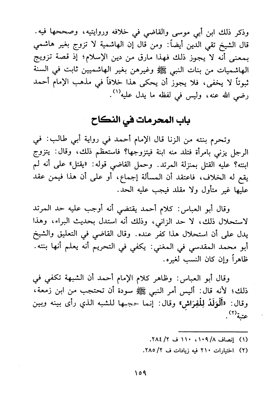 قال: وذكر ذلك ابن أبي موسى والقاضي في خلافه وروايتيه، وصححها فيه. قال الشيخ تقي الدين أيضًا: ومن قال إن الهاشمية لا تزوج بغير هاشمي بمعنى أنه لا يجوز ذلك فهذا مارق من دين الإسلام؛ إذ قصة تزويج الهاشميات من بنات النبي - صلى الله عليه وسلم - وغيرهن بغير الهاشميين ثابت في السنة ثبوتًا لا يخفى، فلا يجوز أن يحكى هذا خلافًا في مذهب الإمام أحمد رضي الله عنه، وليس في لفظه ما يدل عليه (1) .