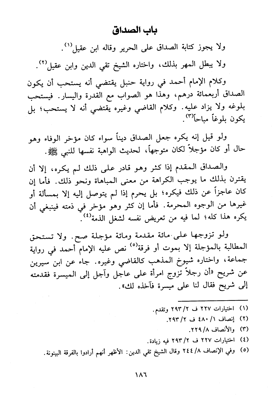 وكلام الإمام أحمد في رواية حنبل يقتضي أنه يستحب أن يكون الصداق أربعمائة درهم، وهذا هو الصواب مع القدرة واليسار. فيستحب بلوغه ولا يزاد عليه. وكلام القاضي وغيره يقتضي أنه لا يستحب؛ بل يكون بلوغًا مباحًا (3) .