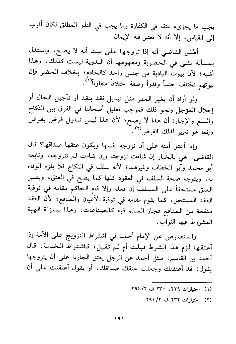 والمنصوص عن الإمام أحمد في اشتراط التزويج على الأمة إذا أعتقها لزم هذا الشرط قبلت أم لم تقبل، كاشتراط الخدمة. قال أحمد بن القاسم: سئل أحمد عن الرجل يعتق الجارية على أن يتزوجها
