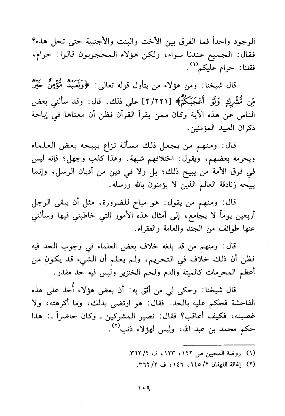 قال: ومنهم من يجعل ذلك مسألة نزاع يبيحه بعض العلماء ويحرمه بعضهم ويقول: اختلافهم شبهة، وهذا كذب وجهل؛ فإنه ليس في فرق الأمة من يبيح ذلك، بل ولا في دين من أديان الرسل، وإنما يبيحه زنادقة العالم الذين لا يؤمنون بالله ورسوله.
