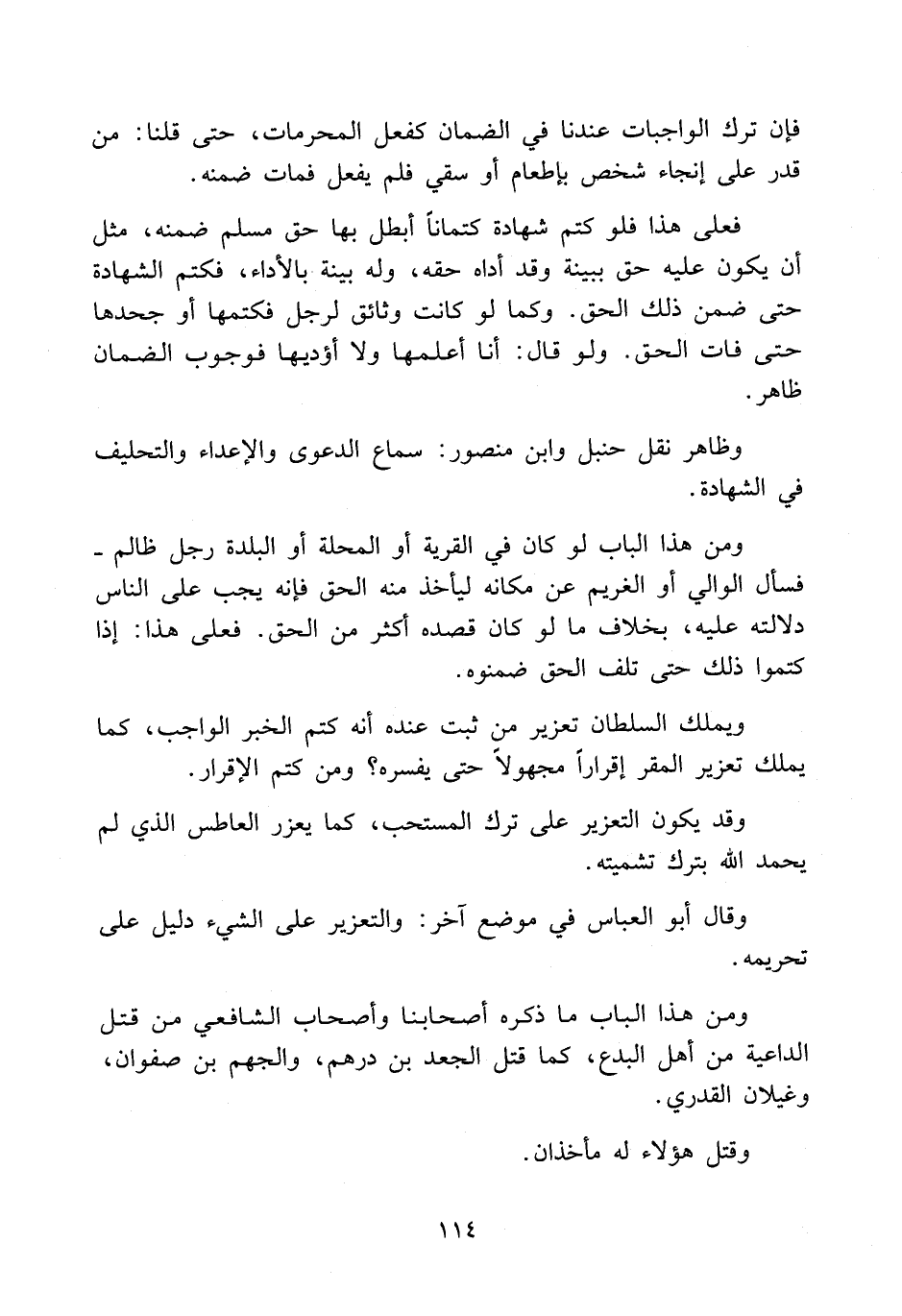ومن هذا الباب لو كان في القرية أو المحلة أو البلدة رجل ظالم فسأل الوالي أو الغريم عن مكانه ليأخذ منه الحق فإنه يجب على الناس دلالته عليه بخلاف ما لو كان قصده أكثر من الحق، فعلى هذا: إذا كتموا ذلك حتى تلف الحق ضمنوه.