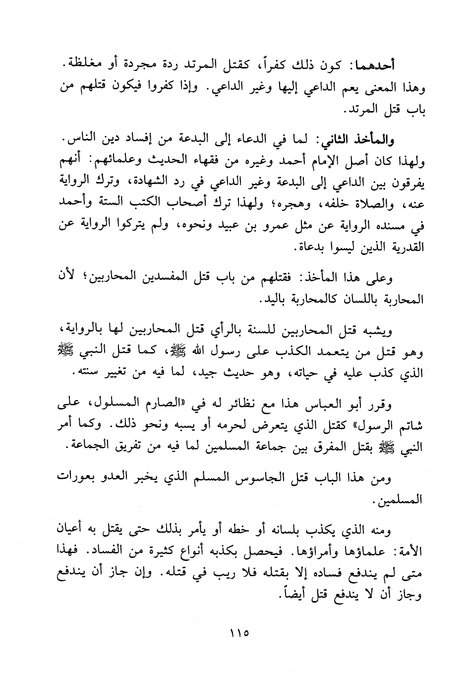 وقرر أبو العباس هذا مع نظائر له في «الصارم المسلول، على شاتم الرسول» كقتل الذي يتعرض لحرمه أو يسبه ونحو ذلك، وكما أمر النبي - صلى الله عليه وسلم - بقتل المفرق بين جماعة المسلمين لما فيه من تفريق الجماعة.