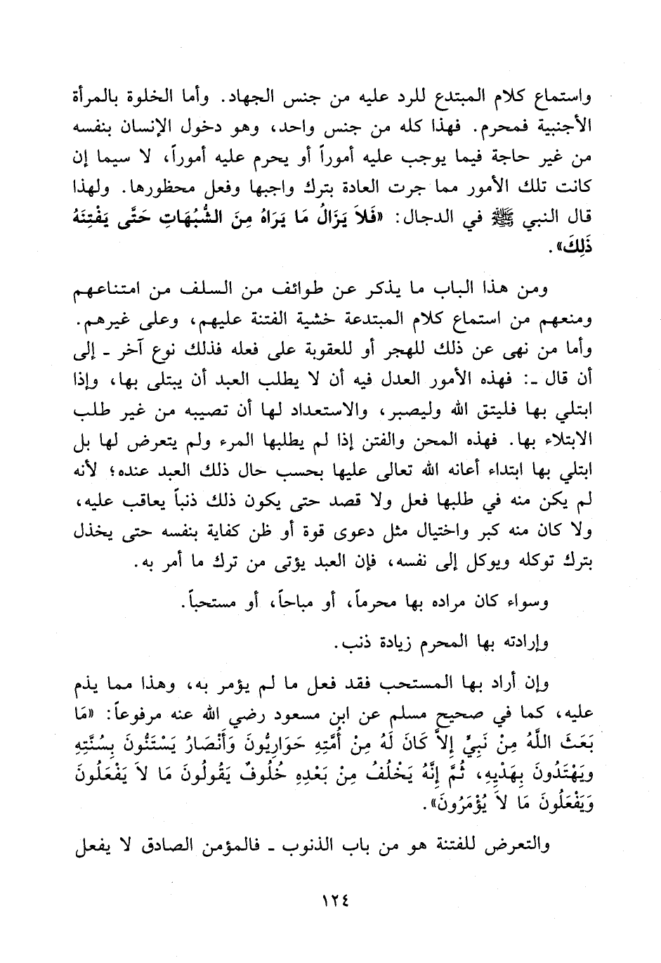 واستماع كلام المبتدع للرد عليه من جنس الجهاد، وأما الخلوة بالمرأة الأجنبية فمحرم فهذا كله من جنس واحد، وهو دخول الإنسان بنفسه من غير حاجة فيما يوجب عليه أمورا أو يحرم عليه أمورا، لا سيما إن كانت تلك الأمور مما جرت العادة بترك واجبها وفعل محظورها، ولهذا قال النبي - صلى الله عليه وسلم - في الدجال: "فلا يزال ما يراه من الشبهات حتى يفتنه ذلك".