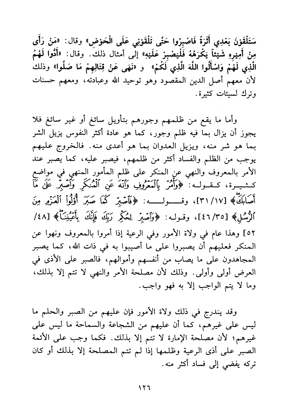 وأما ما يقع من ظلمهم وجورهم بتأويل سائغ أو غير سائغ فلا يجوز أن يزال بما فيه ظلم وجور، كما هو عادة أكثر النفوس يزيل الشر بما هـ شر منه، ويزيل العدوان بما هو أعدى منه، فالخروج عليهم يوجب من الظلم والفساد أكثر من ظلمهم فيصير عليه، كما يصبر عند الأمر بالمعروف والنهي عن المنكر على ظلم المأمور المنهي في مواضع كثيرة كقوله: {وَأْمُرْ بِالْمَعْرُوفِ وَانْهَ عَنِ الْمُنْكَرِ وَاصْبِرْ عَلَى مَا أَصَابَكَ} [17/31] ، وقوله: {فَاصْبِرْ كَمَا صَبَرَ أُولُو الْعَزْمِ مِنَ الرُّسُلِ} [35/46] وقوله: {وَاصْبِرْ لِحُكْمِ رَبِّكَ فَإِنَّكَ بِأَعْيُنِنَا} [48/52] ، وهذا عام في ولاة الأمور وفي الرعية إذا أمروا بالمعروف ونهوا عن المنكر فعليهم أن يصبروا على ما أصيبوا به في ذات الله كما يصبر المجاهدون على ما يصاب من أنفسهم وأموالهم، فالصبر على الأذى في العرض أولى وأولى، وذلك لأن مصلحة الأمر والنهي لا تتم إلا بذلك، وما لا يتم الواجب إلا به فهو واجب.