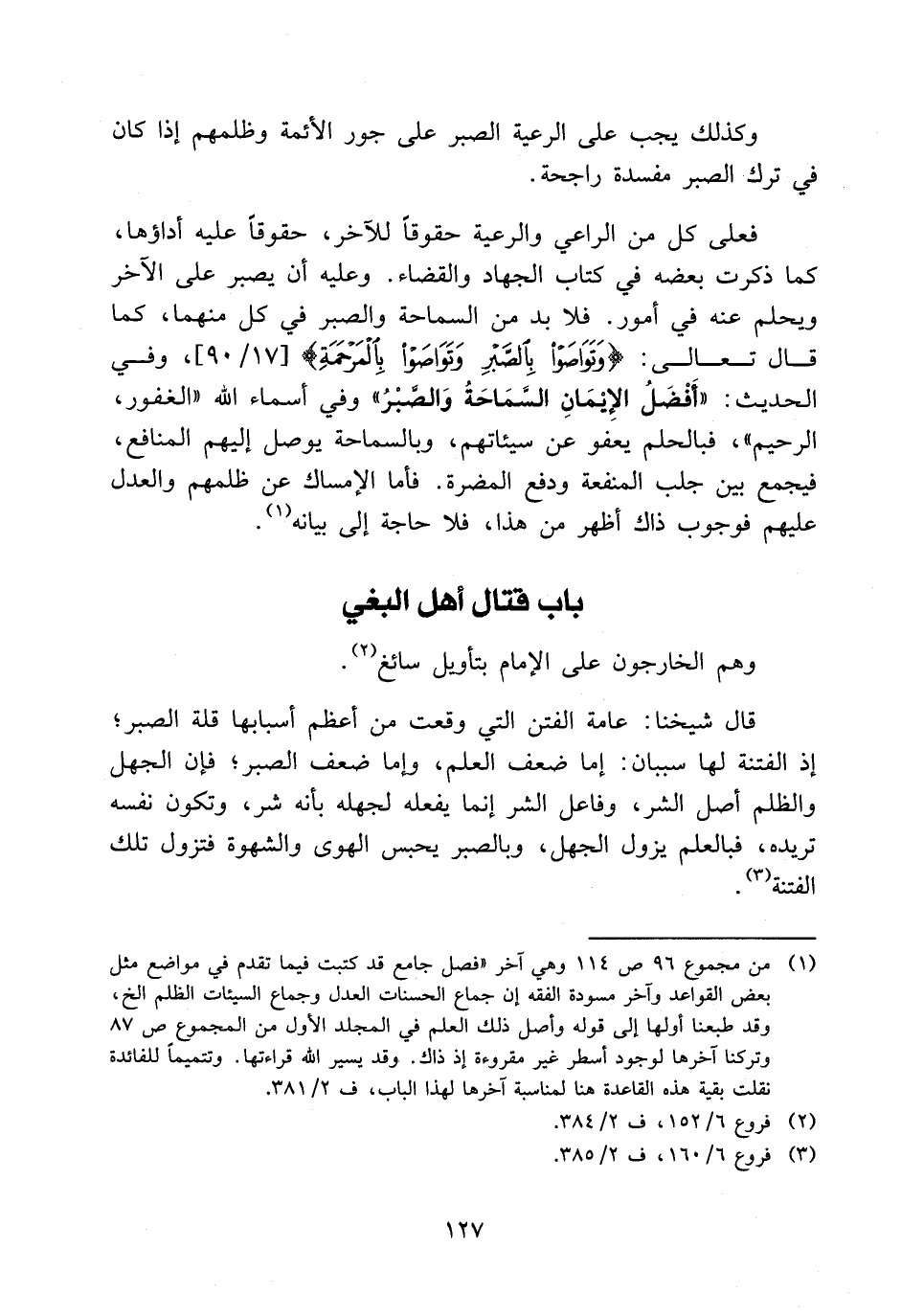 وكذلك يجب على الرعية الصبر على جور الأئمة وظلمهم إذا كان في ترك الصبر مفسدة راجحة.