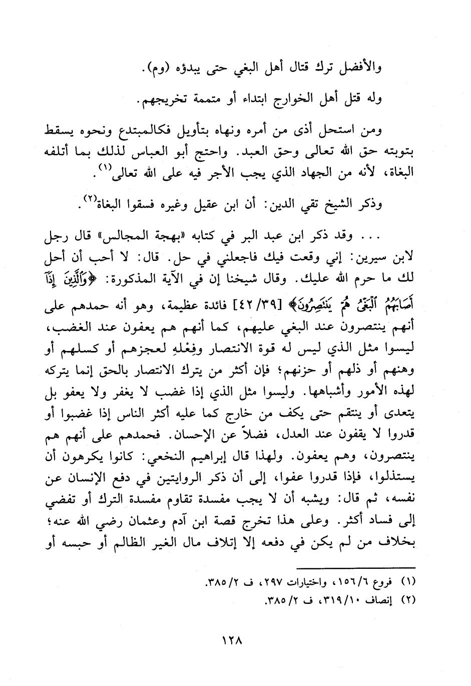 ... وقد ذكر ابن عبد البر في كتابه "بهجة المجالس" قال رجل لابن سيرين: إني وقعت فيك فاجعلني في حل، قال: لا أحب أن أحل لك ما حرم الله عليك، وقال شيخنا إن في الآية المذكورة {وَالَّذِينَ إِذَا أَصَابَهُمُ الْبَغْيُ هُمْ يَنْتَصِرُونَ} [39/24] فائدة عظيمة وهو أن حمدهم على أنهم ينتصرون عند البغي عليهم، كما أنهم هم يعفون عند الغضب، ليسوا مثل الذي ليس له قوة الانتصار وفعله لعجزهم أو كسلهم أو وهنهم أو ذلهم أو حزنهم فإن أكثر من يترك الانتصار بالحق إنما يتركه لهذه الأمور وأشباهها، وليسوا مثل الذي إذا غضب لا يغفر ولا يعفو بل يتعدى أو ينتقم حتى يكف من خارج كما عليه أكثر الناس إذا غضبوا أو قدروا لا يقفون عند العدل، فضلا عن الإحسان.