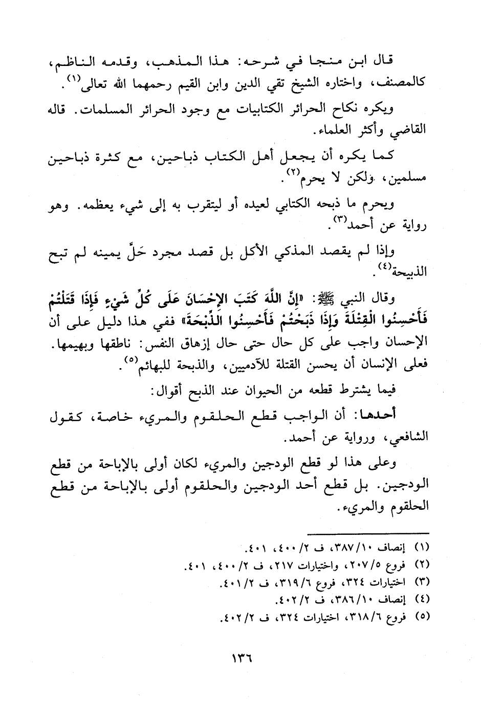 وقال النبي - صلى الله عليه وسلم -: "إن الله كتب الإحسان على كل شيء فإذا قتلتم فاحسنوا القتلة وإذا ذبحتم فأحسنوا الذبحة" ففي هذا دليل على أن الإحسان واجب على كل حال حتى حال إزهاق النفس: ناطقها وبهيمها فعلى الإنسان أن يحسن القتلة للآدميين، والذبحة للبهائم (5) .