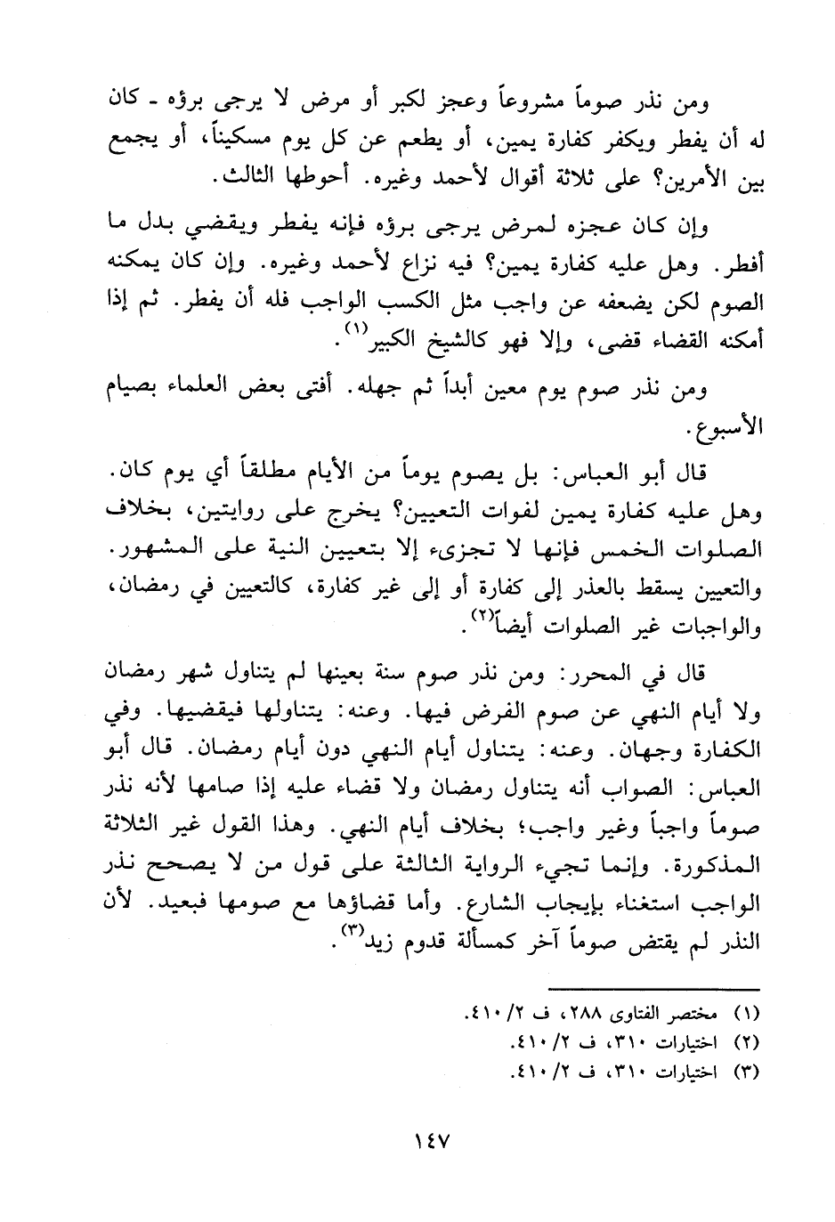 ومن نذر صوما مشروعا وعجز لكبر أو مرض لا يرجى برؤه كان له أن يفطر ويكفر كفارة يمين، أو يطعم عن كل يوم مسكينا، أو يجمع بين الأمرين على ثلاثة أقوال لأحمد وغيره، أحوطها الثالث.