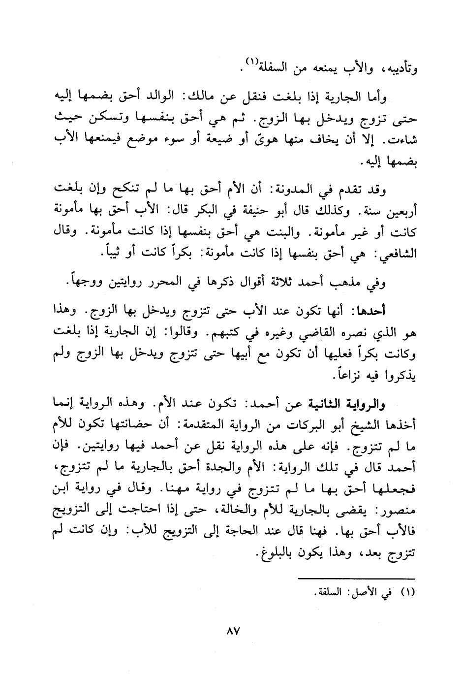 والرواية الثانية: عن أحمد: تكون عند الأم، وهذه الرواية إنما أخذها الشيخ أبو البركات من الرواية المتقدمة أن حضانتها تكون للأم ما لم تتزوج، فإنه على هذه الرواية نقل عن أحمد فيها روايتين، فإن أحمد قال في تلك الرواية، الأم والجدة أحق بالجارية ما لم تتزوج، فجعلهما أحق بها ما لم تتزوج في رواية مهنا، وقال في رواية ابن منصور، يقضي بالجارية للأم والخالة، حتى إذا احتاجت إلى التزويج فالأب أحق بها، فهنا قال عند الحاجة إلى التزويج للأب، وإن كانت لم تتزوج بعد، وهذا يكون بالبلوغ.