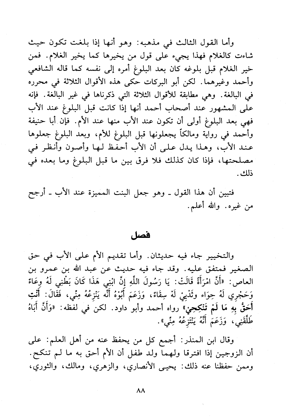 وأما القول الثالث في مذهبه: وهو أنها إذا بلغت تكون حيث شاءت كالغلام فهذا يجيء على قول من يخيرها كما يخير الغلام، فمن خير الغلام قبل بلوغه كان بعد البلوغ أمره إلى نفسه كما قال الشافعي وأحمد وغيرهما، لكن أبو البركات حكى هذه الأقوال الثلاثة في محرره في البالغة، وهي مطابقة للأقوال الثلاثة التي ذكرناها في غير البالغة، فإنه على المشهور عند أصحاب أحمد أنها إذا كانت قبل البلوغ عند الأب فهي بعد البلوغ أولى أن تكون عند الأب منها عند الأم، فإن أبا حنيفة وأحمد في رواية ومالكا يجعلونها قبل البلوغ للأم، وبعد البلوغ جعلوها عند الأب، وهذا يدل على أن الأب أحفظ لها وأصون وأنظر في مصلحتها، فإذا كان كذلك فلا فرق بين ما قبل البلوغ وما بعده في ذلك.