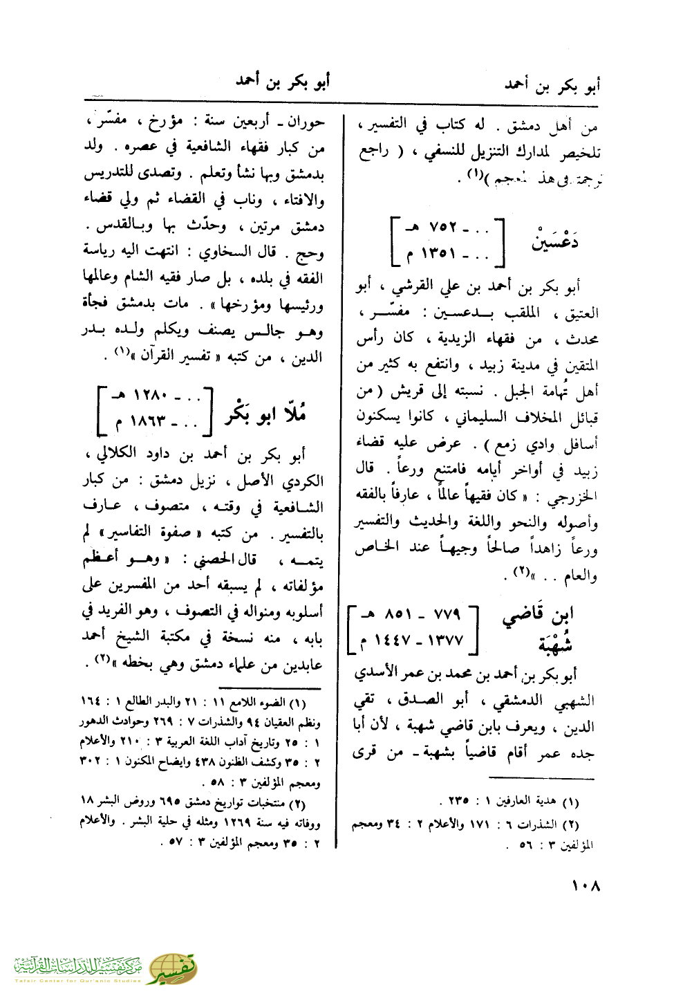 حوران - أربعين سنة: مؤرخ، مفسر، من كبار فقهاء الشافعية في عصره. ولد بدمشق وبها نشأ وتعلم. وتصدى للتدريس والافتاء، وناب في القضاء ثم ولي قضاء دمشق مرتين، وحدث بها وبالقدس. وحج. قال السخاوي: "انتهت إليه رياسة الفقه في بلده، بل صار فقيه الشام وعالمها ورئيسها ومؤرخها". مات بدمشق فجأة وهو جالس يصنف ويكلم ولده بدر الدين، من كتبه "تفسير القرآن" (¬1).