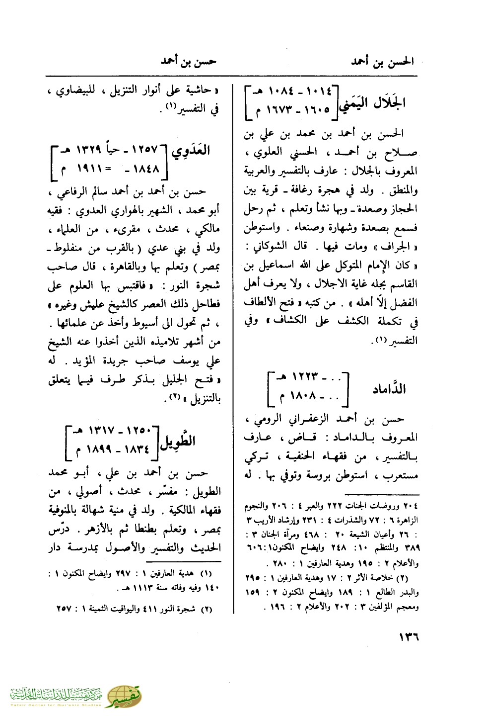 (¬1) خلاصة الأثر 2: 17 وهدية العارفين 1: 295 والبدر الطالع 1: 189 وايضع المكنون 2: 159 ومعجم المؤلفين 3: 202 والأعلام 2: 196.