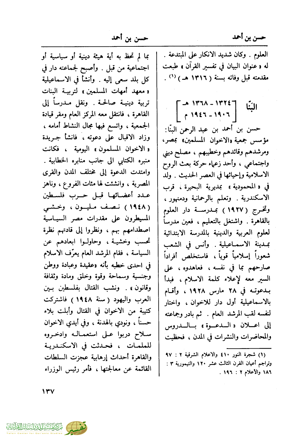 مؤسس جمعية "الاخوان المسلمين" بمصر، ومرشدهم وقائدهم وخطيبهم، مصلح ديني وإجتماعي، وأحد زعماء حركة بعث الروح الإسلامية وإحيائها في العصر الحديث. ولد في "المحمودية" بمديرية البحيرة، قرب الإسكندرية. وتعلم بالرحمانية ودمنهور، وتخرج (1927) بمدرسة دار العلوم بالقاهرة. واشتغل بالتعليم، فعين مدرسا لعلوم العربية والدينية بالمدرسة الابتدائية بمدينة الإسماعيلية. وأنس في الشعب شعورا إسلاميا قويا، فاستخلص أفرادا صارحهم بما في نفسه، فعاهدوه، على السير معه لإعلاء كلمة الإسلام، فبدأ بدعوته في 28 مارس 1928، وأقام بالإسماعيلية أول دار للإخوان، واختار لنفسه لقب المرشد العام. ثم بادر وجماعته إلى إعلان "الدعوة" بالدروس والمحاضرات والنشرات في المدن، فحظيت