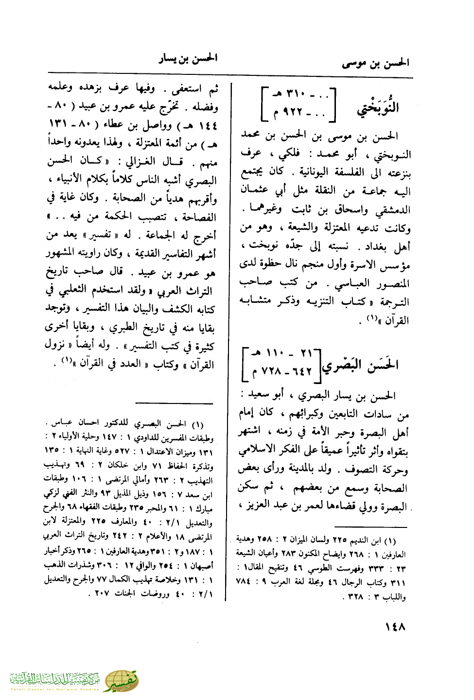 ثم استعفى. وفيها عرف بزهده وعلمه وفضله. تخرج عليه عمرو بن عبيد (80 - 144 هـ) وواصل بن عطاء (85 - 131 هـ) من أئمة المعتزلة، ولهذا يعدونه واحدا منهم. قال الغزالي: "كان الحسن البصري أشبه الناس كلاما بكلام الأنبياء، وأقربهم هديا من الصحابة. وكان غاية في الفصاحة، تتصبب الحكمة من فيه .. " أخرج له الجماعة. له "تفسير" يعد من أشهر التفاسير القديمة، وكان راويته المشهور هو عمرو بن عبيد. قال صاحب تاريخ التراث العربي "ولقد استخدم الثعلبي في كتابه الكشف والبيان هذا التفسير، وتوجد بقايا منه في تاريخ الطبري، وبقايا أخرى كثيرة في كتب التفسير". وله أيضا "نزول القرآن" وكتاب "العدد في القرآن" (¬1).