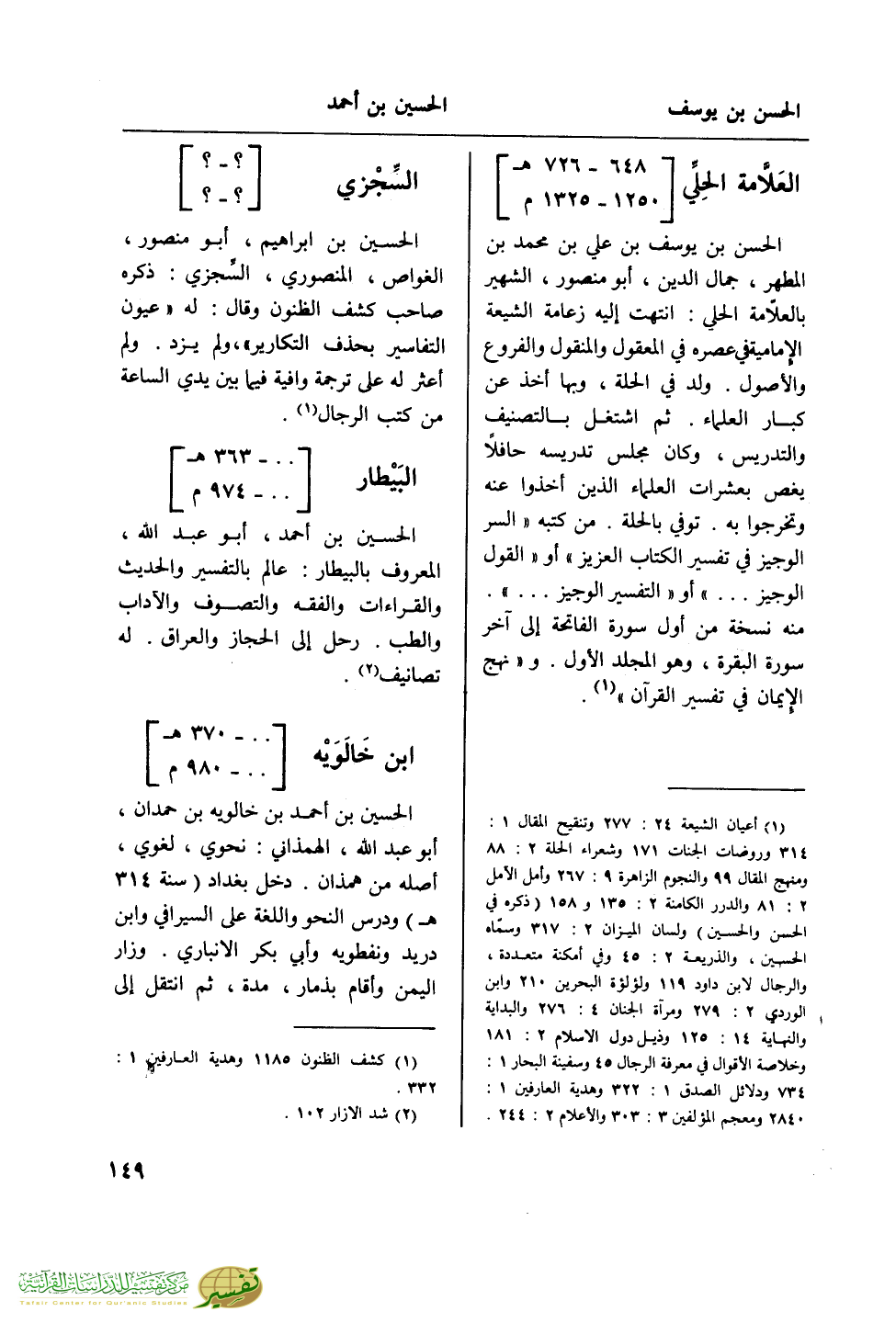 (¬1) أعيان الشيعة 24: 277 وتنقيح المقال 1: 314 وروضات الجنات 171 وشعراء الحلة 2: 88 ومنهج المقال 99 والنجوم الزاهرة 9: 267 وأمل الأمل 2: 81 والدرر الكامنة 2: 135 و 158 (ذكره في الحسن والحسين) ولسان الميزان 2: 317 وسماه الحسين، والذريعة 2: 45 وفي أمكنة متعددة، والرجال لابن داود 119 ولؤلؤة البحرين 215 وابن الوردي 2: 279 ومرآة الجنان 4: 276 والبداية والنهاية 14: 125 وذيل دول الإسلام 2: 181 وخلاصة الأقوال في معرفة الرجال 45 وسفينة البحار 1: 734 ودلائل الصدق 1: 322 وهدية العارفين 1: 2840 ومعجم المؤلفين 3: 303 والأعلام 2: 244.