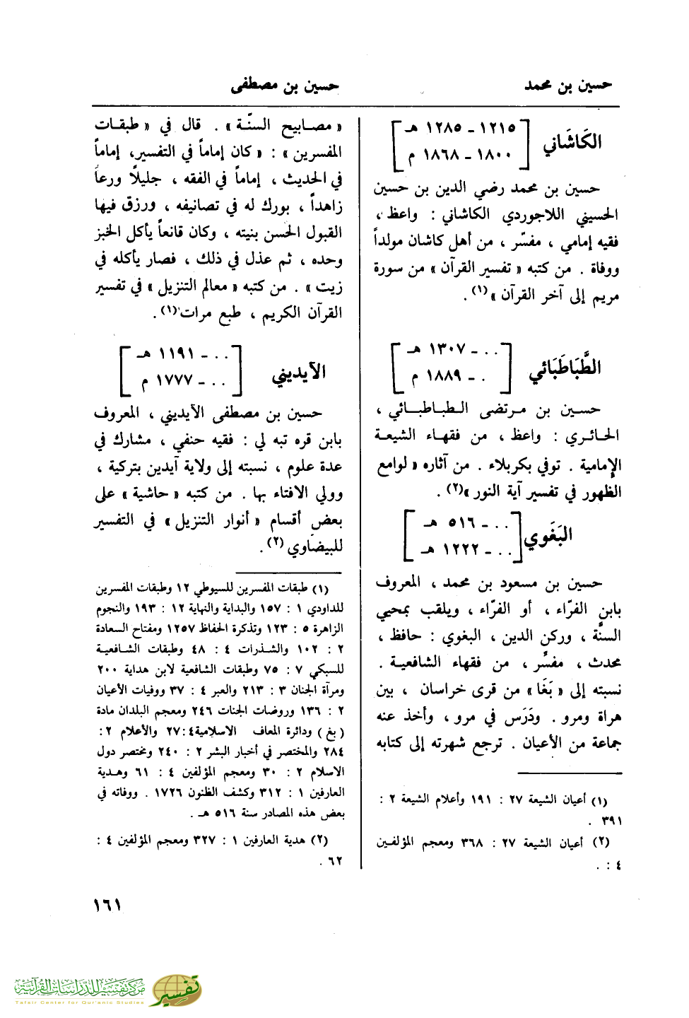 (¬1) طبقات المفسرين للسيوطي 12 وطبقات المفسرين للداودي 1: 157 والبداية والنهاية 12: 193 والنجوم الزاهرة 5: 123 وتذكرة الحفاظ 1257 ومفتع السعادة 2: 102 والشذرات 4: 48 وطبقات الشافعية للسبكي 7: 75 وطبقات الشافعية لابن هداية 200 ومرآة الجنان 3: 213 والعبر 4: 37 ووفيات الأعيان 2: 136 وروضات الجنات 246 ومعجم البلدان مادة (بغ) ودائرة المعارف الإسلامية 4: 27 والأعلام 2: 284 والمختصر في أخبار البشر 2: 240 ومختصر دول الإسلام 2: 30 ومعجم المؤلفين 4: 61 وهدية العارفين 1: 312 وكشف الظنون 1726. ووفاته في بعض هذه المصادر سنة 516 هـ.