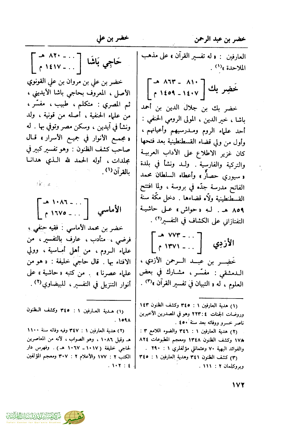 (¬2) هدية العارفين 1: 347 وفيه وفاته سنة 1100 هـ وقيل 1086، وهو الصواب، لأنه من المعاصرين لحاجي خليفة (1017 - 1067 هـ). وفهرس دار الكتب 2: 177 والأعلام 2: 307 ومعجم المؤلفين 4: 102.