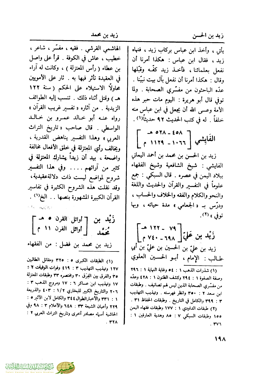 الهاشمي القرشي. فقيه، مفسر، شاعر، خطيب، عاش في الكوفة. قرأ على واصل بن عطاء (رأس المعتزلة)، وكانت له آراء في العقيدة تأثر فيها به. ثار على الأمويين محاولا الاستيلاء على الحكم (سنة 122 هـ) وقتل أثناء ذلك. تنسب إليه الطوائف الزيدية. من آثاره "تفسير غريب القرآن" رواه عنه أبو خالد عمرو بن خالد الواسطي. قال صاحب "تاريخ التراث العربيي" وهذا التفسير يناهض القدرية، وفيلف رأي المعتزلة في خلق الأفعال مخالفة واضحة، بيد أن زيدا يشارك المعتزلة في كثير من آرائهم ... . وفي هذا التفسير شروح لمواضع ليست ذات دلالة عقيدية، وقد نقلت هذه الشروح الكثيرة في تفاسير القرآن الكبيرة المشهورة بنصها .. الخ (¬1).