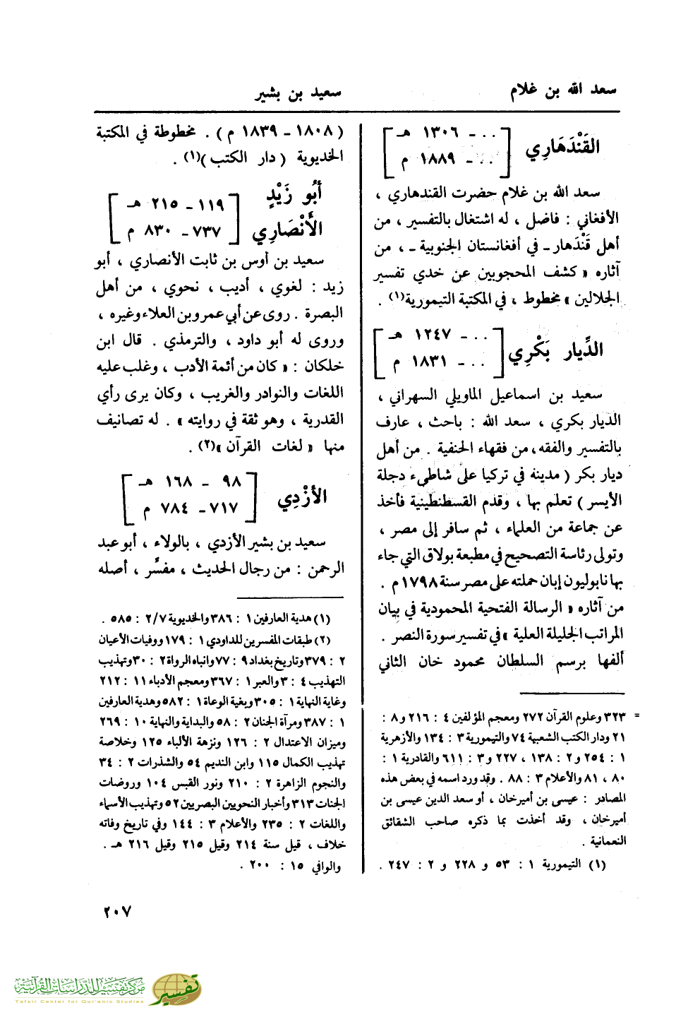 (¬2) طبقات المفسرين للداودي 1: 179 ووفيات الأعيان 2: 379 وتاريخ بغداد 9: 77 وأنباء الرواة 2: 30 وتهذيب التهذيب 4: 3 والعبر 1: 367 ومعجم الأدباء11: 212 وغاية النهاية 1: 305 وبغية الوعاة 1: 582 وهدية العارفين 1: 387 ومرآة الجنان 2: 58 والبداية والنهاية 10: 269 وميزان الاعتدال 2: 126 ونزهة الألباء 125 وخلاصة تهذيب الكمال 115 وابن النديم 54 والشذرات 2: 34 والنجوم الزاهرة 2: 210 ونور القبس 104 وروضات الجنات 313 وأخبار النحويين البصريين 52 وتهذيب الأسماء واللغات 2: 235 والأعلام 3: 144 وفي تاريخ وفاته خلاف، قيل سنة 214 وقيل 215 وقيل 216 هـ. والوافي 15: 200.