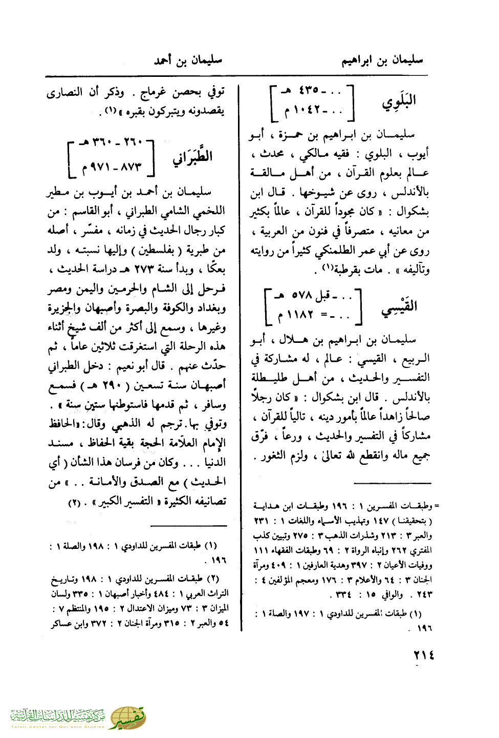 من كبار رجال الحديث في زمانه، مفسر، أصله من طبرية (بفلسطين) وإليها نسبته، ولد بعكا، وبدأ سنة 273 هـ دراسة الحديث، فرحل إلى الشام والحرمين واليمن ومصر وبغداد والكوفة والبصرة وأصبهان والجزيرة وغيرها، وسمع إلى أكثر من ألف شيخ أثناء هذه الرحلة التي استغرقت ثلاثين عاما، ثم حدث عنهم. قال أبو نعيم: دخل الطبراني أصبهان سنة تسعين (290 هـ) فسمع وسافر، ثم قدمها فاستوطنها ستين سنة". وتوفي بها. ترجم له الذهي وقال: "الحافظ الإمام العلامة الحجة بقية الحفاظ، مسند الدنيا ... وكان من فرسان هذا الشأن (أي الحديث) مع الصدق والأمانة .. " من تصانيفه الكثيرة "التفسير الكبير". (¬2)